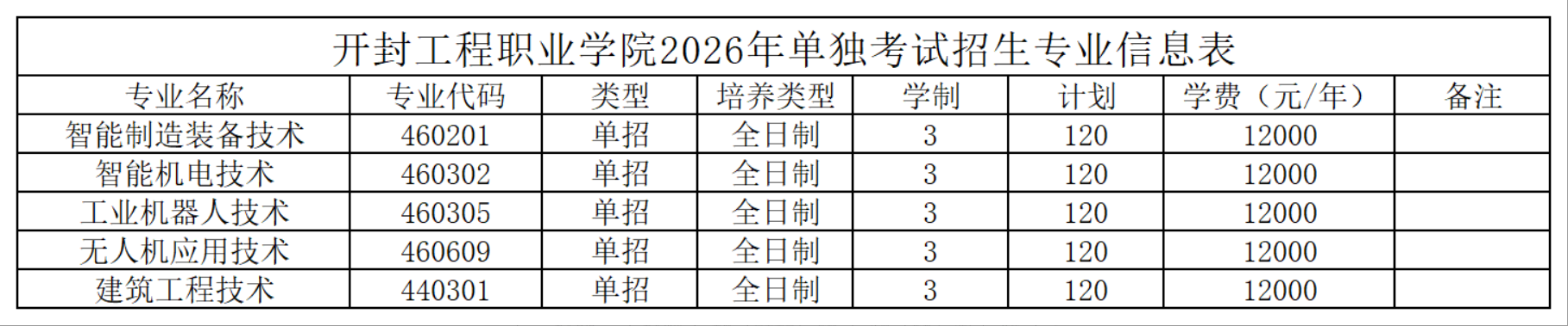 开封工程职业学院2026年高职单独考试招生计划